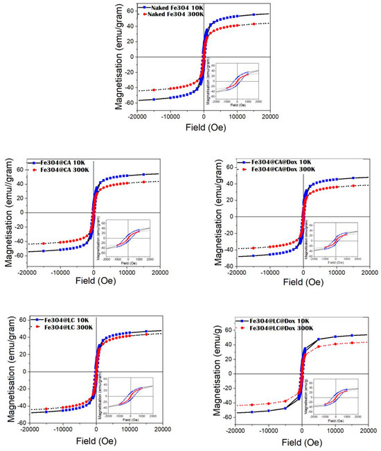 A complex structural and morphological characterization of all obtained samples has already been reported in [30,32] and therefore only the conclusion of interest for this work will be resumed here. In the case of naked Fe3O4 MNPs, similar broad size distributions ranging from 3 nm to 20 nm were evidenced in all preparations, with two types of morphologies as follows: spherical shape (for the finest particles) and faceted shape of a cubic or rhombohedral type (for the larger ones). Notably, a change in the morphological parameters (e.g., a slightly larger size distribution extending up to 30 nm) was observed only for the Fe3O4@LC@Dox MNPs, indicating the possible influence of the covering organic molecules on the magnetic configuration of the inorganic core only for this branch of samples.