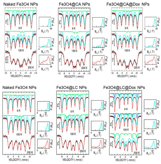 Notably, the almost similar thermal dependence of <Bhyp>, together with the corresponding values of the average magnetic hyperfine field, for samples in the first series, namely naked Fe3O4, Fe3O4@CA, and Fe3O4@CA@Dox magnetic NPs, suggests similar values of anisotropy energy, KV (K is the anisotropy constant and V the MNP volume), for all NPs in the series. Assuming there is a similar average magnetic volume for all NPs in this series, the very similar magnetic relaxation, and hence KV products, leads to the conclusion of a very similar anisotropy constant in these samples. That is, similar magnetic configurations can be assumed for MNPs in this series, as it will be proven from the deep investigation of the low-temperature Mössbauer spectra presented in the next section.