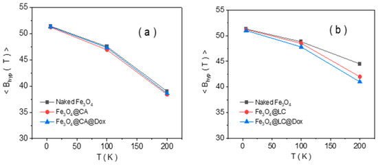 The Mӧssbauer spectra at the lowest temperature of 6 K consist, in all cases, of a broad sextet, as expected in the case of Fe oxide MNPs, with distributed configurations of Fe ions. The sextets become even broader at increasing temperatures, showing collapsing behavior that starts at 200 K and is specific to MNPs in the magnetic relaxation regime. This aspect leads to the possibility of having a unitary fitting of all spectra at increasing temperatures via a distribution of magnetic hyperfine fields, according to the algorithm proposed in [36]. The probability distribution of magnetic hyperfine fields is shown on the right side of each spectrum. At a glance, Figure 3 shows the similar collapsing behavior of naked Fe3O4 NPs and NPs functionalized with CA (Fe3O4@CA and Fe3O4@CA@Dox). On the other hand, naked Fe3O4 NPs and NPs functionalized with LC (Fe3O4@LC and Fe3O4@LC@Dox) show a different collapsing behavior, which is also different among the three samples. This shows a clear difference in the magnetic structure of the two series of functionalized samples, which also gives a first hint for adding new magnetic spectral components in the MNPs functionalized with LC, as compared to the ones functionalized with CA. The evolution of the average magnetic hyperfine field, <Bhyp>, versus temperature, as presented in Figure 4, can also be considered for a quantitative comparison of the two series of samples.