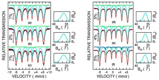 On the other hand, as evidenced by the 200 K Mӧssbauer spectra, the magnetic relaxation of the naked Fe3O4 NPs in the first series is slightly enhanced compared with the corresponding naked Fe3O4 NPs in the second series, under an almost identical magnetic hyperfine field value of 6 K and spontaneous magnetization. In these peculiar conditions, which suggest similar magnetic configurations of naked Fe3O4 NPs (e.g., similar magnetic configuration and K anisotropy constant) in the two series, the only explanation for the slightly faster relaxation of the naked MNPs in the first series is a slightly lower (e.g., by a few percent) average size of Fe3O4 NPs in this series, as compared to the Fe3O4 NPs in the second series. This aspect is not entirely unexpected given the criticality of NP size distribution on the processing conditions. However, such small differences in the size distribution of naked Fe3O4 NPs in the two series cannot be possibly evidenced by either TEM or SQUID investigations but only via the magnetic relaxation behavior within very short time windows, which is specific to Mӧssbauer spectroscopy. In the context of the high sensitivity of the Mӧssbauer spectra on the magnetic relaxation phenomena, the most proper investigation concerning the differences between the magnetic configuration of MNPs should be carried out at the lowest temperature of 6 K, where the MNPs are in a complete magnetically frozen regime (see Figure 5).