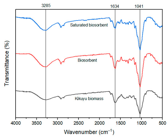 Figure 1 shows the FTIR spectra of the B, BK, and BKS, respectively, where a large number of absorption peaks are observed that characterize the presence of the functional groups, -OH (3285 cm−1), -C=O (1634 cm−1), -C-O- (1041 cm−1), and C=C- (1690 cm−1), confirming their lignocellulosic nature [20,21,22]. The first three functional groups, where the oxygen atom is present with its two pairs of free electrons, provide the BK points of high electron density, which become active adsorption centers. In the case of group C=C-, the electron density arises from the π bond; therefore, group C=O has a higher electronic density. The difference between the spectra occurs with lower values of transmittance percentage (higher absorbance percentage), indicating a better arrangement of the negatively charged functional groups in the BK with respect to the B. This is attributed to acid–base treatment [23] and its screening with Cr (III) cations (BKS), whereby the active attraction of these cations towards the surface of the BK in the adsorption process occurs. This is due to complexation with functional groups that contain oxygen, such as the hydroxyl group, and electrostatic attraction using carbonyl, confirming effective adsorption of a chemical nature [24].