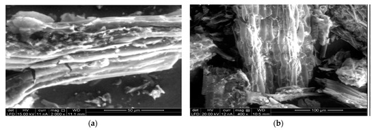 Through BET analysis, it was possible to estimate that 1 g of kikuyu biomass has 0.0303 m2 of specific surface area, increasing to 0.4268 m2 (an increase of 1308.58%) due to the acid treatment solubilizing the hemicellulose and the basic treatment rupturing its polymer chains and then increasing the porosity and surface area of the biosorbent, thus increasing the quantity of ionic functional groups [20,21,22,23,24,25]. These attributes are typical of biosorbents; for instance, higher specific surface areas for the biomasses of banana piths, pineapple stems, and bamboo stems were determined [26]; these results could be attributed to the chemical modifications that those biomasses underwent. The morphological micrograph (a) of the BK (Figure 2) shows an elongated, striated, and laminated solid structure formed by horizontal rough plates with the presence of randomly distributed surface undulations and cavities, providing surface texture and different levels of microporosity, which, thus, enhances adsorption capacity [21,23]. The micrograph of the BKS (b), however, presents an ordered honeycomb-shaped structure, which could be due to the saturation of the pores with Cr (III). Similar structures are shown with the yellow passion fruit shell bioadsorbent [27].