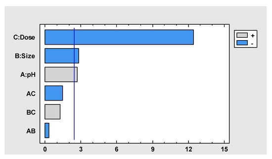 Figure 4 shows a standardized Pareto diagram for the adsorption capacity. In the graph, it can be inferred that the three variables (biosorbent dose, size, and pH) exhibit significant effects, because they crossed the blue line, with respect to the adsorption capacity.