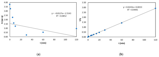Data fitted to kinetic models: (a) pseudo first order (b) pseudo second order.