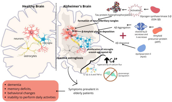 Summary of the complex pathophysiology of Alzheimer’s disease. The disease is characterized by a series of changes in the brain, such as the deposition of β-amyloid plaques and the formation of neurofibrillary tangles. The irregular unfolding of amyloid precursor proteins (APPs) and ApoeE generates the deposition of β-amyloid plaques, while a high activation of the GSK-3β enzyme promotes the hyperphosphorylation of Tau proteins, which polymerizes to form the tangles. These abnormal protein aggregates promote astrocyte reactivity, microglia activation, increased Ca+ influx, increased pro-inflammatory factors, decreased synapses, and neuronal death. Throughout the lives of patients, the main cognitive symptoms are dementia, memory deficit, changes in behavior, and inability to perform daily tasks.