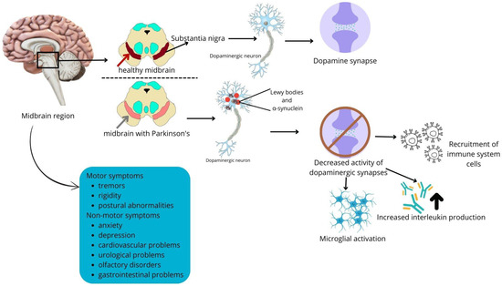 Mechanisms that lead to neuronal death in Parkinson’s Disease. In the midbrain region, more specifically in the substantia nigra, the red arrows indicate a dense region with dopaminergic neurons, while the gray arrow indicate a decrease in dopaminergic neurons due deposit of aggregated proteins such as α-synuclein forms Lewy bodies, ultimately leading to cell death and causing a decline in the number of dopaminergic neurons. Consequently, there is a decrease in the number of dopaminergic synapses and the hyperactivation of microglia and an increase in pro-inflammatory cytokines and activated immune cells. Among the symptoms, patients present motor deficits, such as tremors and rigidity, and non-motor symptoms, such as gastrointestinal problems and depression.