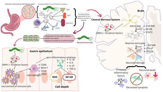 The metabolites of H. pylori can also compromise the CNS, as is the case of outer membrane vesicles (OMVs), which have the ability to cross biological barriers. The bacterium, through its virulence factors like the VacA cytotoxin, exerts chemotactic effects and promotes an increase in the pro-inflammatory response, including the production of TNF-α, IL-8, and ROS. These factors can compromise BBB integrity and intensify neuroinflammation. Additionally, the pathogen also induces the expression of genes related to AD, such as ApoE2, ApoE4, APP, and TLR-4 [118].
