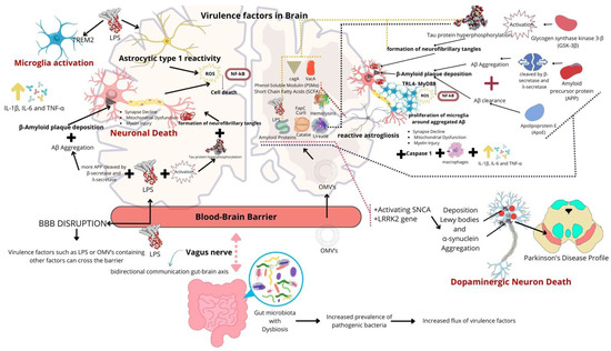 The microorganisms composing the microbiota can produce various virulence factors for their self-protection against the host’s defenses. These virulence factors can play an important role in the exacerbation of ND. One example is the production of urease by the bacterium Helicobacter pylori. Recent studies revealed that the systemic administration of this protein induces a (neuro)inflammatory response in rodents and modifies the phosphorylation status of Tau, a hallmark of Alzheimer’s disease (AD) [6]. Other bacterial virulence factors also could potentially contribute to ND. Bacterial lipopolysaccharides (LPSs) and proteins of the outer membrane of Gram-negative bacteria appear in elevated levels in the plasma of AD patients as compared to a control group [7]. LPSs have been implicated in the formation of extracellular amyloids [8,9].