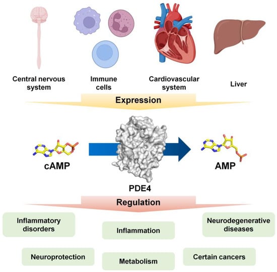 Overview of PDE4 expression and regulation. PDE4 is expressed in various tissues and cell types. Inhibition of PDE4 leads to the accumulation of cyclic adenosine monophosphate (cAMP) by preventing its degradation, which in turn modulates the pathophysiology of inflammatory diseases, metabolic disorders, cancer, and neurological conditions. The images were obtained from BioRender (https://biorender.com/: accessed on 22 November 2024).
