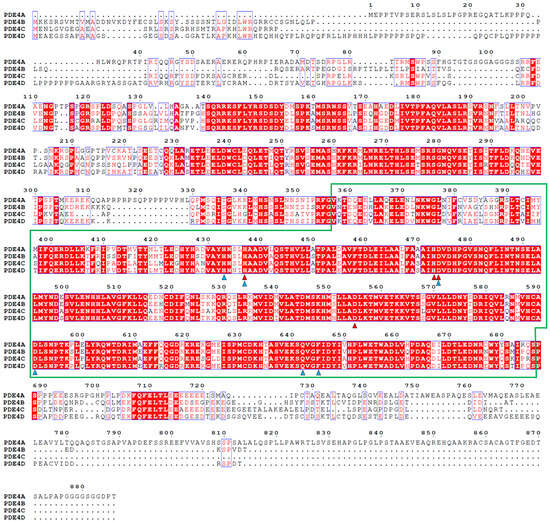 Alignment of the canonical amino acid sequences of PDE4A (UniProt code: P27815), PDE4B (Q07343), PDE4C (Q08493), and PDE4D (Q08499). The catalytic domain region of the PDE4A subfamily is indicated by a green box. The “HD” domain motif for Mg2+ (or Mn2+) and Zn2+ binding is indicated by red triangles, while the 3′,5′-cyclic AMP (or AMP) binding site is indicated by blue triangles.