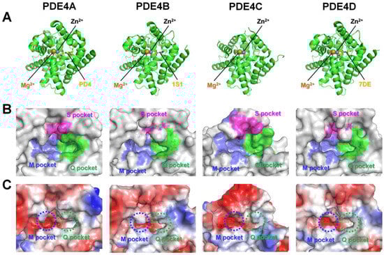 The position and distribution of the residues involved in the Q, M, and S pockets of PDE4A–D were similar (Figure 4B), but the detailed architecture differed due to the different ligands bound to the active sites of PDE4A–D. For example, in the selected high-resolution model structure, PDE4A, PDE4B, and PDE4D were complexed with Mg2+, Zn2+, and inhibitors, but the chemical structure of the inhibitor differed, inducing a different conformation of the entrance of the substrate binding pocket due to their unique ligand interaction. Meanwhile, PDE4C was complexed with Mg2+ and Zn2+, without the chemical compound, showing the disordered S pocket region and not showing the deeper substrate binding pocket in the crystal structure. Because the crystal structure of identical ligand-bound PDE4s was not reported, the formation of the substrate binding pocket of PDE4A–4D could not be compared directly. Meanwhile, in the electrostatic surface, the M and Q pockets of PDE4A–4D commonly have negative and hydrophobic charged surfaces, respectively, indicating that the overall ligand recognition in the active site pocket of PDE4s is similar (Figure 4C).