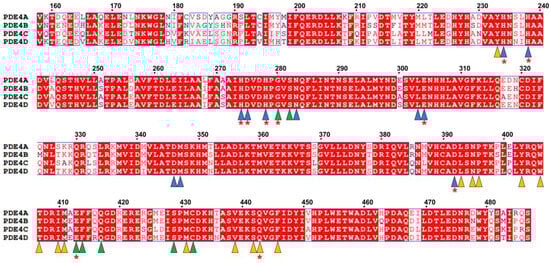In a previous study, the residues involved in the substrate binding pockets of PDE4B and PDE4D were classified [41]; however, the substrate binding pockets of PDE4A and PDE4C have not yet been classified in detail into three categories. Sequence alignment of the catalytic domain showed that the key residues involved in the active site pockets of PDE4B and PDE4D are conserved across the PDE4 subfamily (Figure 5), providing further analysis of the substrate binding pockets of PDE4A and PDE4C.