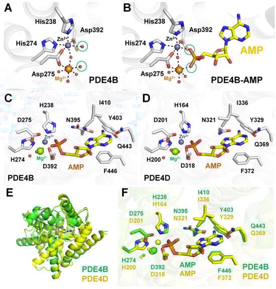 In the AMP-, Zn2+-, and Mn2+-bound catalytic domain of PDE4B, AMP, the product of the hydrolytic reaction, binds to both the M and Q pockets at the active site (Figure 6B). The phosphate group of AMP coordinates with Zn2+ and Mg2+ in the M pocket of PDE4B, forming the octahedral coordination of the Zn2+ and Mg2+. The adenosine base of AMP occupies the Q pocket, while the ribose group of AMP is positioned between the M and Q pockets (Figure 6B). The completely conserved Gln443 forms two hydrogen bonds with the adenine moiety of AMP. The orientation of Gln443 is stabilized by a hydrogen bond with the hydroxyl group of Tyr403, and the adenine ring additionally forms a hydrogen bond with Asn395 (Figure 6B). The binding mode of AMP in PDE4D was found to be nearly identical to that in PDE4B (Figure 6C). Therefore, two water molecules involved in the coordination of the Mg2+ or Zn2+ at the binuclear metal ion center at the M pocket of native PDE4B/PDE4D alternated with two oxygen atoms in the phosphate group of the AMP, showing the stable coordination of the binuclear metal ion center of PDE4B/PDE4D (Figure 6D). These structural results indicate that the binding and selectivity of the cAMP substrate in PDE4B and PDE4D require various interactions, including metal binding, phosphate group coordination, hydrophobic affinity, and hydrogen bonding with the nucleotide [43]. Superimposition of AMP-, Zn2+-, and Mg2+-bound PDE4B and PDE4D structures showed high similarity, with an r.m.s. deviation of 0.498 Å (Figure 6E). The position and conformation of the residues involved in AMP coordination were almost identical, except for the residue between Asn395 from PDE4B and Asn321 from PDE4D.