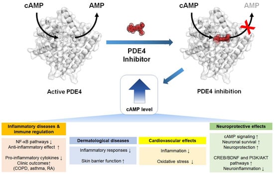 - Fan, T.; Wang, W.; Wang, Y.; Zeng, M.; Liu, Y.; Zhu, S.; Yang, L. PDE4 inhibitors: Potential protective effects in inflammation and vascular diseases. Front. Pharmacol. 2024, 15, 1407871. [Google Scholar] [CrossRef] [PubMed]