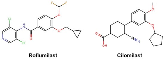 Numerous PDE4 inhibitors have been developed [44,54,55,56]. To date, roflumilast, apremilast, and crisaborole have been approved for the treatment of inflammatory airway diseases, psoriatic arthritis, and atopic dermatitis, respectively [44]. Among these various potential PDE4 inhibitors, the second generation of selective PDE4 inhibitors, such as roflumilast and cilomilast (Figure 8), have demonstrated clinical efficacy by elevating intracellular cAMP levels, thereby suppressing proinflammatory cytokine production and modulating inflammatory responses [57,58,59,60,61]. In particular, roflumilast, approved by the US Food and Drug Administration for treating chronic obstructive pulmonary disorder, exerts significant anti-inflammatory effects, while cilomilast has shown potential in preclinical and clinical studies for its anti-inflammatory and bronchodilatory properties [46].