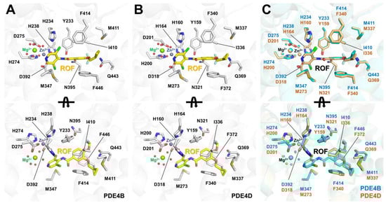 Crystal structures of PDB4 complexed with the roflumilast. Close-up view of roflumilast (ROF) binding to (A) PDE4B (PDB code: 1XMU) and (B) PDE4D (PDB code: 1XOQ). (C) Superimposition of the roflumilast-bound PDE4B (cyan) and PDE4D (light orange) structures.