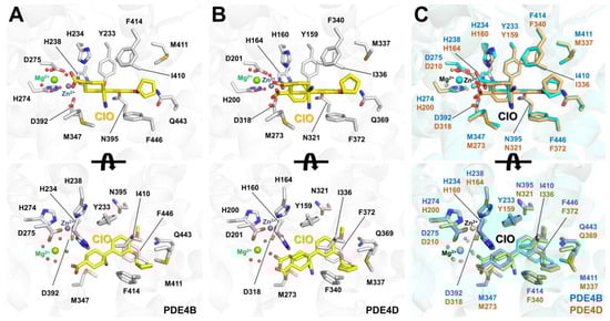 In roflumilast-bound PDE4B and PDE4D, the M pocket is occupied by Zn2+ and Mg2+ ions [41,65]. These metal ions are octahedrally coordinated with conserved histidine and aspartic acid residues, as well as a water molecule. However, the position of the metal ions and the water molecule and the distances between the metal ions and their coordinating residues differ slightly between roflumilast-bound PDE4B (PDB code: 1XMU) and PDE4D (1XOQ and 3G4L) (see below). This indicates that the M pocket, containing the metal ions and water molecule, is not rigid. The overall binding configurations of the roflumilast at the active site pocket of PDE4B and PDE4D were similar (Figure 9A,B). The dichloropyridyl group of roflumilast is positioned in the M pocket of PDE4s, while the difluoromethoxy and cyclopropylmethyl groups are located in the Q pocket. The nitrogen atom in the dichloropyridyl group of roflumilast forms a hydrogen bond with a water molecule coordinated with Mg2+, with distances of 3.01/3.13 Å and 2.89/2.93 Å for PDE4B-1XMU and PDE4D-1XOQ, respectively [41]. In PDE4D-3G4L at 2.5 Å resolution, the distance between roflumilast and the water molecule interacting with Mg2+ across three PDE4D molecules ranges from 2.63 to 3.04 Å, while no water molecule interacting with Mg2+ is observed in one other PDE4D molecule [65]. The dialkoxyphenyl group is considered a scaffold for various inhibitors of PDE4B and PDE4D. The dialkoxyphenyl group of roflumilast is sandwiched between the hydrophobic clamp, with Phe446 and Ile410 in PDE4B and Phe372 and Ile336 in PDE4D (Figure 9B). In PDE4B, the difluoromethoxy group of roflumilast binds at the Q1 pocket, and its fluoride atoms and oxygen atom interact with the OD1 atom of Asn395 and the NE2 atom of Gln443, respectively, at distances of 3.43–3.75 Å and 3.03–3.16 Å. The cyclopropyl methyl group of roflumilast is located at the Q2 pocket and stabilized by hydrophobic residues Met411, Phe414, Met431, and Phe446. In PDE4D, the difluoromethoxy group of roflumilast binds at the Q1 pocket, and its fluoride atoms and oxygen atom interact with the OD1 atom of Asn395 and the NE2 atom of Gln369, respectively, at distances of 3.43–3.67 Å and 3.08–3.15 Å. The cyclopropyl methyl group of roflumilast is located at the Q2 pocket and stabilized by hydrophobic residues Met337, Phe340, Met357, and Phe372 [41]. Therefore, the binding modes of roflumilast to PDE4B and PDE4D exhibit high similarity.