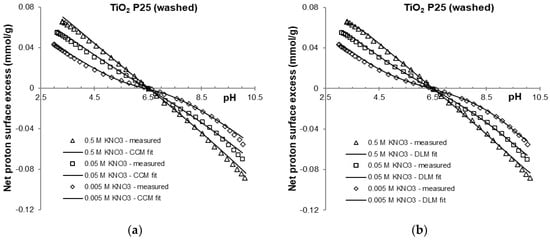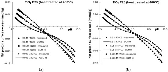 Potentiometric acid-base titration of heat treated and purified samples were carried out over the range of pH 3 to 10 in the indifferent electrolyte KNO3. The net proton consumption vs. pH curves of the three different background electrolyte concentrations intersect at a common intersection point (CIP). The curves are shown in Figure 1 and Figure 2 and are similar to those frequently found in the literature [16,39]. Due to the chemical stability of titania in the pH region studied here, no sign of solid-phase dissolution was observed. The pHPZC values determined from the net proton consumption vs. pH curves for the purified titania samples at the different ionic strengths were very similar to the values reported for TiO2 P25 [17], with an average value of pH = 6.5 ± 0.1.