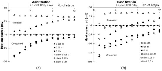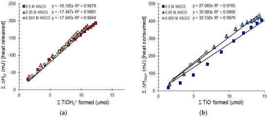The cumulative heat of surface protonation and deprotonation reactions (calculated with correction for water formation) during titration was plotted as a function of the calculated amount of surface charges formed in reactions (1) and (17) (Figure 7). The plots of experimental data (Figure 7) show a satisfactory linear relationship for both the protonation and deprotonation reactions on the surface sites of titania. The linearity indicates that the molar enthalpy changes of surface charging reactions (ΔHdepr and ΔHpr) are independent of surface charge density within experimental accuracy, i.e., the temperature congruence given in Equation (15) is valid under the present experimental conditions. The occurrence of temperature congruence implies that there is no significant specific adsorption of supporting electrolyte ions, there is only one type of surface group (or the contribution of different types is equal at any pH value), and the interaction between neighboring surface groups is not influenced by the protonation or deprotonation of either [28]. Thus, the slope of the cumulative heat of surface charge formation vs. the amount of charged sites function in Figure 7 can be identified with the partial molar enthalpies of surface protonation and deprotonation reactions (ΔHpr and ΔHdepr). The calculated values are summarized in Table 3.