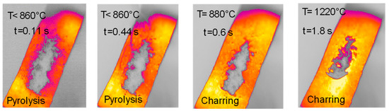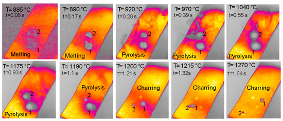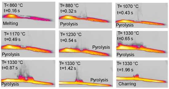 Figure 3, Figure 4, Figure 5, Figure 6, Figure 7 and Figure 8 report images captured during pyrolysis in the HSR of the three lignocellulosic components investigated at a target strip temperature in the range of 1000–1300 °C: hemicellulose, cellulose and lignin.