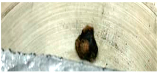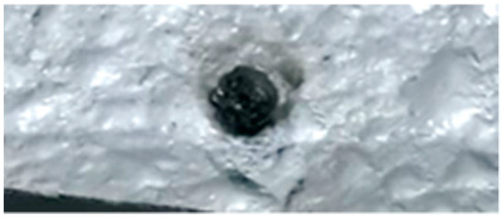 The behavior of hemicellulose in the HSR is documented in the top view, shown in Figure 3, and the lateral view, shown in Figure 5, of the thermocamera during two similar pyrolysis experiments. Note that experiments on hemicellulose have also been reported in [24]. The sample of hemicellulose has an original cubical particle shape. In the experiment shown in Figure 3, two balks of particles of 1 × 0.8 cm and 0.8 × 0.6 cm are initially deposited on the strip. Between 0.06 s and 0.17 s, they generate two almost spherical agglomerates with a diameter of 0.6 and 0.5 cm and smoothed edges. Pyrolysis occurs when the strip’s temperature range is 900–1200 °C, and an intense release of volatiles forms a cloud of hot gas around the two clusters. As previously discussed, with larger agglomerates, the temperature gradient between the strip and the upper layers of the agglomerates is about 100 °C, but rolling phenomena can possibly lower these values. Shrinkage phenomena are observed at the end of the pyrolysis stage. Between 1.21 and 1.64 s, the charring stage takes place with a progressive shrinkage of the particle. Figure 4 reports the char particle (first spot) collected at the end of the experiment. Time, temperature and observed particle sizes of the two clusters during the experiments at a target strip temperature ≈ 1300 °C are reported in Table 1.
