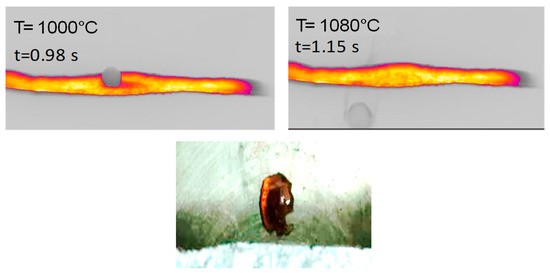 (Top) HSR experiment of hemicellulose at a target strip temperature of ≈1000 °C (lateral view). (Bottom) Brownish particle recovered at the end of the experiment [24].
