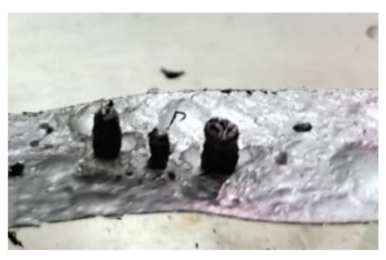 Figure 9 reports the top views of the pyrolysis experiments in the HSR on naphthalene pitch at a target temperature T ≃ 1600 °C. Notably, the behavior of naphthalene pitch is very interesting. In Figure 9, at t = 0.33 s, the powder dispersed on the strip undergoes pyrolysis, and the volatile efflux is quite strong, as also shown in the later photograms. At t = 0.50 s, the sample forms three distinct clusters on the strip. These clusters progressively grow in size in the vertical direction, forming three columns. At the end of the test, three porous black char columns of 7–10 mm in height are recovered on the strip (Figure 10). On the other hand, Figure 11 reports the lateral views of naphthalene pitch pyrolysis at a target temperature 1300 °C, with the evolution of volatiles and the formation of much shorter columns.