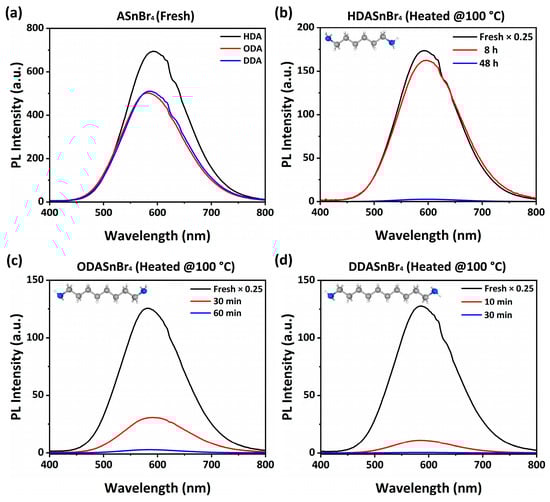 (a) Photoluminescence of ASnBr4 as a function of time in ambient air at 100 °C for (b) A = HDA, (c) A = ODA, and (d) A = DDA.