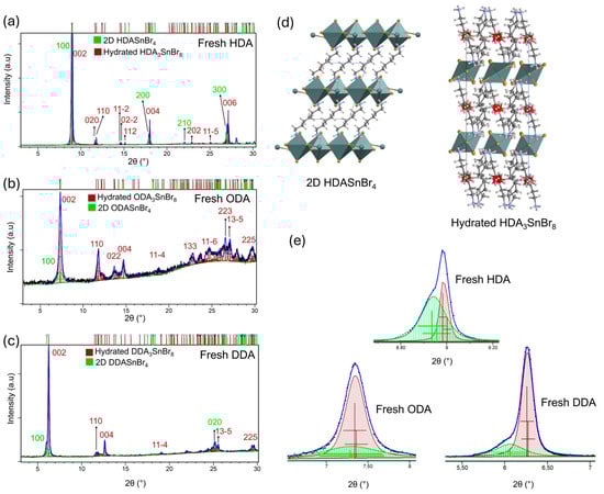 From Figure 2a, we can observe that the fresh HDA-based sample contained the 2D HDASnBr4 perovskite phase and 1D HDA3SnBr8·(H2O) phase. A previously published structure of HDAPbBr4 [28] was used for the refinement of HDASnBr4. The Le-Bail fitting showed that HDASnBr4 exhibits the longest-axis periodicity of 11.48 Å which is smaller than reported value for HDAPbBr4 (12.02 Å), as expected since Sn2+ is smaller than Pb2+. The structure as reported by Ning et al. [11] was used for the refinement of the 1D phase, HDA3SnBr8·(H2O). Similar to the case of HDA, Figure 2b,c show that as-prepared ODA and DDA samples also contain both 2D and hydrated 1D phases. The shift in most prominent diffraction lines (100 of 2D phase and 002 of 1D phase) towards lower 2θ angles can be observed which is expected considering the increase in the length of spacers; as the number of carbon atoms of spacers increases from HDA (6 atoms) to ODA (8 C atoms) to DDA (10 C atoms) the distance between the inorganic layers consequently also increases leading to the shift in the diffraction lines towards larger d-values (smaller 2θ angles). It is important to notice that although all three as-prepared samples contain both 2D and 1D phases, the amount of phases present in the samples are significantly different; from Figure 2e we can observe that the ODA and DDA samples dominantly contain 1D phase with a smaller amount of the 2D perovskite phase also present. On the other hand, the HDA sample contains approximately two times the quantity of 2D phase relative to 1D phase. Quantitative analysis of the fresh samples is given in Table S1.