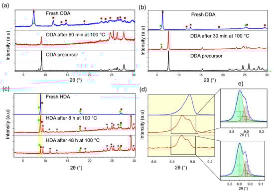 Thus, XRD analysis has been conducted after thermal treatment of HDA-, ODA- and DDA-based perovskites at 100 °C as shown in Figure 3. In agreement with observed PL behavior, both 2D and 1D phases originally present in the ODA sample after 60 min at 100 °C completely decomposed and only diffraction lines belonging to the ODA precursor could been observed (Figure 3a). In the case of the DDA sample, the 1D phase decomposed after 30 min at 100 °C and the XRD pattern showed lines belonging to DDA precursor; however, the 2D DDASnBr4 phase still remained present (Figure 3b). Unlike ODA and DDA, thermal treatment of the HDA sample at 100 °C, as shown in Figure 3c, still contained both 2D and 1D phases even after a significantly longer period of 48 h. The rest of the diffraction lines belong to the HDA precursor.