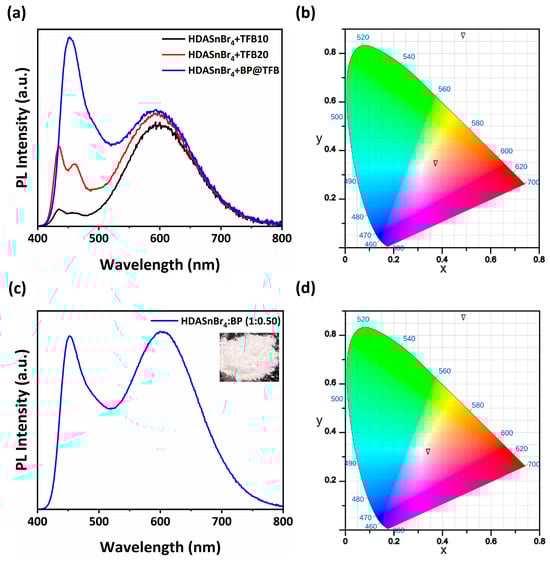 (a) PL spectra of HDASnBr4 film with different blue-emitting polymer formulations. TFB10 and TFB20 denote 10 and 20 mg of TFB dissolved in 1 mL chlorobenzene, and BP@TFB indicates 10 mg of BP dissolved in TFB solution. (b) CIE coordinates chart for HDASnBr4+ BP@TFB corresponding to (0.37, 0.34). (c) PL spectrum of HDASnBr4 BP mixture with a ratio 1:0.50 (inset shows the corresponding photo under UV illumination) and (d) corresponding CIE coordinates (0.34, 0.32).