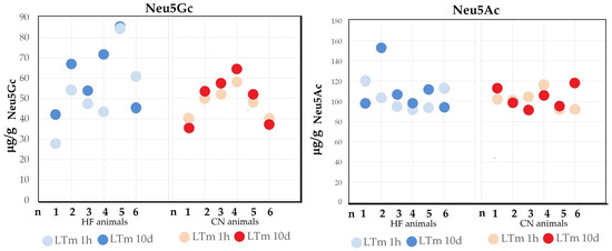 | Neu5Gc | 0.34 * | 0.51 ** | ns | −0.42 ** | −0.37 * | ns | ns | ns |