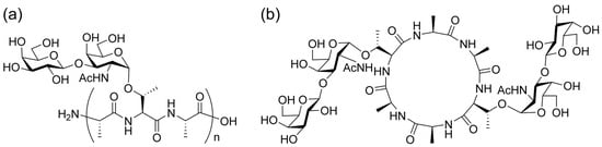 We performed a systematic study on the synthesis and analysis of glycopeptides [,]. During this process, we found that cyclic glycopeptides that replicated during the synthesis of linear antifreeze glycoproteins (AFGPs; Figure 1a) in nature [] exhibited antifreeze activity []. We also found that the glycan moiety of the cyclic antifreeze glycoprotein [] (Figure 1b) could be directly observed via in-source decay (ISD) MALDI-TOF MS with a modified matrix for glycan-selective ionization []. The fragmentation patterns of linear O-linked glycopeptides have been studied and utilized in glycoproteomic studies [,,,,]. However, to our knowledge, there have been no comparative studies with O-linked cyclic peptides, particularly regarding their peptide sequences and side chain fragmentation. In this study, we report the characteristic PSD patterns of linear and cyclic AFGP, as obtained via MALDI-TOF/TOF MS analysis, together with the results of a comparison with their peptide backbones.