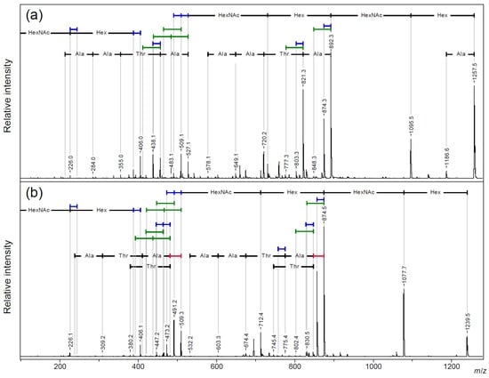 In the small m/z region, the sodium adduct ions of glycan fragments were found as two pairs of 18 Da neutral loss (blue bar in figures) at m/z 226.1 and 244.1 for N-acetylgalctosamine residues (HexNAc) and m/z 388.1 and 406.1 for additional galactose residues (Hex), as reported in our ISD MALDI-TOF MS analysis of synthetic AFGP mixtures and intact mucins []. In the larger m/z region, the sequential neutral loss of the two pairs of disaccharide branches from the precursor ion signal gave the sodium adduct ion of the core peptide, with a free hydroxyl group of the threonine side chain and its dehydro-form as the main fragment ion signals. Following the loss of a single and a pair of disaccharide branches (m/z 892.3 and m/z 527.1, respectively), sequential neutral losses of the peptide skeleton were observed for linear AFGP (Figure 2a). Then, 28 Da neutral losses (red bar in figures) were observed before the amino acid sequence signals only in cyclic AFGP (Figure 2b). This could have been due to the loss of CO from the oxazolone structure during the ring-opening reaction, preceding the loss of amino acids [,,].