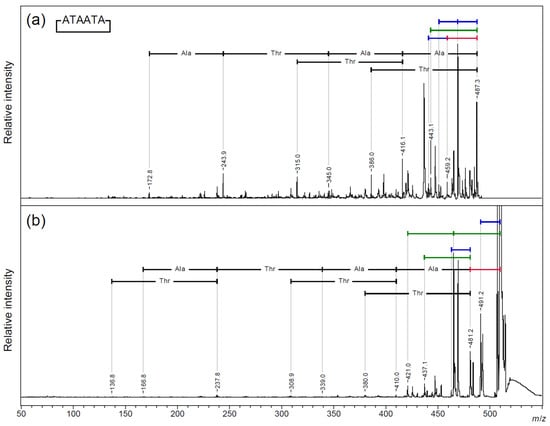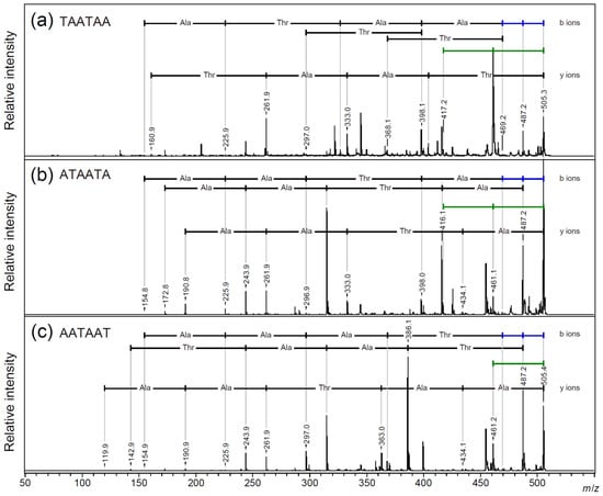 The proton adduct ions produced more prominent amino acid fragment ions, but no characteristic amide bond fragmentation positions were observed in either adduct ion. Regarding the protonated ions of the cyclic peptide, the signal for the neutral loss of 18 Da was dominant and repeated twice, whereas, regarding the sodium adduct ions, the signal for the loss of 44 Da was dominant and repeated twice. In cyclic peptides, the neutral loss of an amino acid residue requires the fragmentation of two amide bonds; therefore, the fragmentation behavior of this side chain may be significantly different from that of linear peptides. Therefore, we compared the PSD fragmentation patterns of the three linear peptide skeletons of two-repeat AFGP, TAATAA, ATAATA, and AATAAT via the MALDI-TOF/TOF MS analysis of the proton and sodium adduct precursor ions (Figure 4, Figure 5 and Figure S4: m/z 315–510 and Figure S5: m/z 340–535).