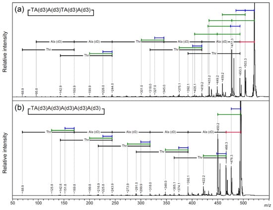 MALDI-TOF/TOF analysis of [M + Na]+ precursor ions for (a) alanine deuterium-labeled cyclic AFGP core peptide and (b) cyclic TA(d3)A(d3)A(d3)A(d3)A(d3). Blue bar—18 Da loss; green bar—44 Da loss; red bar—28 Da loss.
