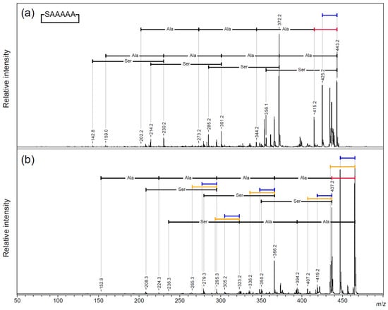 MALDI-TOF/TOF analysis of (a) [M + H]+ and (b) [M + Na]+ precursor ions for cyclic-SAAAAA. Blue bar—18 Da loss; yellow bar—30 Da loss; red bar—28 Da loss.