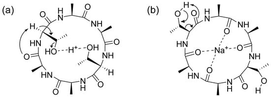 These fragmentation patterns clearly show that both the 18 Da and 44 Da neutral losses originate from the threonine side chain. For the cyclic peptide, the protonated precursor ion was dominated by a neutral loss of 18 Da. A 44 Da neutral loss was observed as the predominant fragment signal from the sodium adduct precursor ions. These different fragmentation reactions are expected to arise from differences in the coordination sites of the adduct ions (Figure 8). The protonated ions are expected to promote dehydration by coordinating with threonine hydroxyl groups (Figure 8a). The sodium adduct ions promoted the formation of a turn structure suitable for the loss of acetaldehyde (Figure 8b). In the case of sodium adduct ions of linear and cyclic AFGP, the glycosylation of the threonine hydroxyl group inhibits the conformation suitable for de-acetaldehyde to give a 44 Da neutral loss even for the sodium adduct ion (Figure 2). The de-glycoside reaction to give an m/z 406 signal (Figure 2) as a free disaccharide also promoted the formation of a dehydrated peptide skeleton. Interestingly, the mechanism of the 44 Da neutral loss from the threonine side chain of the cyclic peptide might differ from those previously reported in [,] and in our study using the linear peptide skeletons of AFGP (Figure 4 and Figure 5). This is likely because threonine adopts a conformation suitable for the neutral loss of acetaldehyde due to hydrophobic interactions between the methyl groups of alanine and threonine []. The hydrophobic interactions of the methyl groups are an important factor in the antifreeze activity of AFGP []. The replacement of threonine with serine changes the conformation and antifreeze activity [], as well as the selectivity and reactivity of the neutral loss of the side chain (Figure 6 and Figure 7). The hydroxyl groups of threonine and serine represent the main stage of post-translational modification, and the conformational changes associated with post-translational modification constitute the switch for protein function, as well as the functional control of drug candidates composed of cyclic (glyco)peptides [,,].
