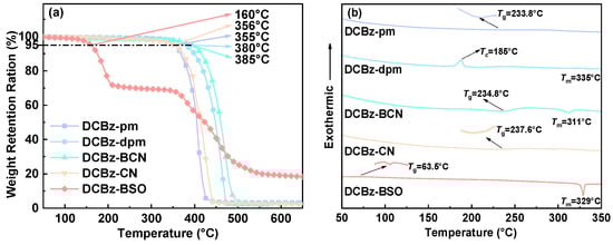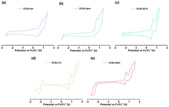 Electrochemical properties were characterized by cyclic voltammetry (CV). As shown in Figure 5, the relevant data are listed in Table 2. Oxidation signals near 0.7 V are observed for the five compounds, which are attributed to the oxidation of the eight-membered ring unit with a HOMO level of about −5.5 eV. A reversible reduction signal was observed in DCBz-CN (Figure 5d), while an irreversible reduction signal was observed in DCBz-BSO (Figure 5e). The energy gap differences were calculated to be 2.75 and 3.08 eV, respectively, based on the measured electrochemical properties. However, no significant reduction signals of DCBz-pm (Figure 5a), DCBz-dpm (Figure 5b), and DCBz-BCN (Figure 5c) were observed. They are attributed to pyrimidine’s weak electron deficiency ability, which is difficult to reduce. At the same time, the electrons of the two benzene rings in DCBz-BCN are delocalized to the cyanogen unit, resulting in an increase in electron cloud density of the two cyanogen units. This makes it difficult for the compound to be reduced. Therefore, the energy gap differences calculated from the starting bands of their UV–vis absorption spectra for DCBz-pm, DCBz-dpm, and DCBz-BCN are 3.07, 2.94, and 2.90 eV, respectively.