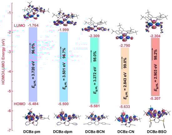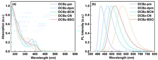 The ultraviolet–visible (UV–vis) absorption and photoluminescence (PL) spectra of DCBz-pm, DCBz-dpm, DCBz-BCN, DCBz-CN, and DCBz-BSO were measured in toluene solution. The photophysical data are summarized in Table 1. The highly intense absorption peaks below 320 nm are attributed to the delocalized π–π* transition originating from the eight-membered ring. Additionally, the weak intensity absorption peaks ranging from 360 nm to 400 nm are ascribed to the charge-transfer (CT) transition from the electron-rich eight-membered ring to the electron-deficient groups like pyrimidine, cyano, and sulfone (Figure 2a). In the PL spectra, compared to DCBz-pm, DCBz-dpm exhibits a significant redshift and broadening as the number of electron-missing bases increases (Figure 2b). When compared the emitters of DCBz-dpm, DCBz-BCN, DCBz-CN, and DCBz-BSO, they showed significant redshift and broadening as the electron deficiency intensifies. The observed redshift and spectral broadening arise from the strong CT state between the electron-rich eight-membered ring and the electron-deficient moiety [27,28]. The transient photoluminescence decay curves of the five luminescent materials demonstrated that they all had very short lifetimes of only several nanoseconds under degassed conditions in toluene solution (Figure S1). No delayed long lifetimes were observed, which suggested that these emitters were fluorescent materials.
