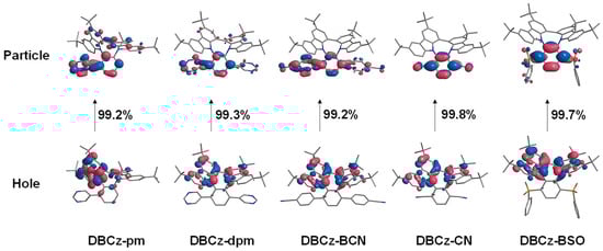 To investigate the geometrical and electronic properties of the five compounds, a theoretical calculation was performed via density functional theory (DFT) and time-dependent DFT (TD-DFT). Non-metal atoms of C, H, N, O, and S were calculated based on B3LYP/6-31G(d, p). The excitation behaviors of the compounds were calculated by the TD-DFT method based on optimized geometries at the ground states. All calculations were carried out by using the Gaussian 09 program. The optimized ground-state (S0) structures are shown in Figure 3. The nonplanar structure of the rigid eight-membered ring is conducive to the inhibition of fluorescence quenching induced by molecular aggregation. The highest occupied molecular orbital (HOMO) is located mainly on the eight-membered ring rigid skeleton with slight scattering on the pyrimidine ring, while the lowest unoccupied molecular orbital (LUMO) is concentrated on the electron-deficient unit. As the degree of electron deficiency increases, the LUMO energy level decreases and the separation between HOMO and LUMO tends to be complete. Furthermore, the theoretical calculations show that the HOMO→LUMO transition of these compounds exerts a dominant influence on the S0→S1 transition, and the contribution rates are 96.0%, 96.7%, 98.0%, 99.0%, and 98.2%, respectively. Therefore, all compounds exist in the CT state [29]. The calculations of the natural transition orbital (NTO) from S0 to S1 based on the optimized S1 configuration are shown in Figure 4. The proportions from hole to particle are 99.2%, 99.3%, 99.2%, 99.8%, and 99.7%, respectively. The hole and electron are almost completely separated, which is similar to the frontier molecular orbital (FMO) distribution of the ground state, and thus all of these emitters show CT state [30,31].