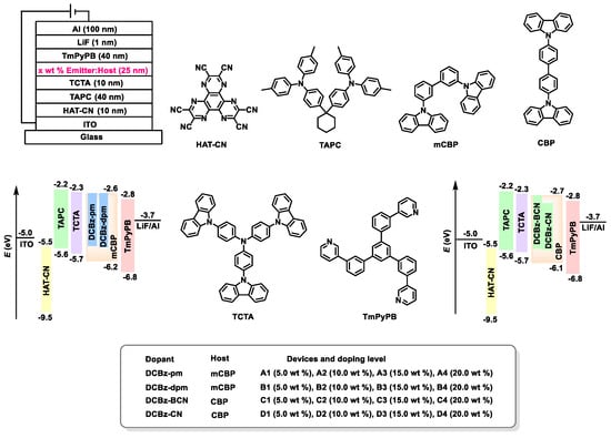 DCBz-pm, DCBz-dpm, DCBz-BCN, and DCBz-CN exhibit good thermal stability and are utilized for fabricating devices using a vacuum deposition process. The device structures and the molecular structures of these functional materials are illustrated in Figure 6. The optimized device structure is ITO (indium tin oxide)/HAT-CN (1,4,5,8,9,11-Hexaazatriphenylenehexacarbonitrile) (10 nm)/TAPC (bis [4-(N,N-ditolylamino)-phenyl]cyclohexane) (40 nm)/TCTA (tris[4-(9H-carbazol9-yl)phenyl]amine) (10 nm)/Emitter (5.0/10.0/15.0/20.0 wt%): Host (25 nm)/TmPyPB (1,3,5-tri(m-pyrid-3-yl-phenyl)benzene) (40 nm)/LiF (1 nm)/Al (100 nm). Compound HAT-CN was used as a hole injection layer (HIL) material because of its suitable energy level that matches well with the anode and the adjacent organic layers to easily accept holes from the anode and then transfer them to the next organic layer with a relatively small energy barrier. Compound TAPC was used as hole-transporting material for its relatively high hole mobility. Compound TCTA also has relatively high hole mobility and its suitable HOMO energy level between TAPC and the EML could help the hole injection into the EML. Compound TmPyPB was used as electron-transporting as well as a hole blocking layer because of its relatively high electron mobility and its deep HOMO energy level. Compound LiF was served as electron-injection material since it is well-aligned LUMO with the adjacent organic semiconductor layers and the cathode which is favorable for electron injection. As for the host material, compared with CBP (4,4′-Bis (N-carbazolyl)-1,1′-biphenyl), the host material mCBP (3,3′-Di (9H-carbazol-9-yl)-1,1′-biphenyl) has a higher triplet exciton energy. Therefore, for the devices based on blue emitter (DCBz-pm and DCBz-dpm), mCBP is used as the host material [32,33], and they are named as A1–A4 and B1–B4. For the devices based on green emitter (DCBz-BCN and DCBz-CN), CBP is used as the host material [34,35], and they are named as C1–C4 and D1–D4.