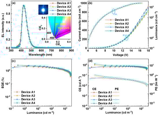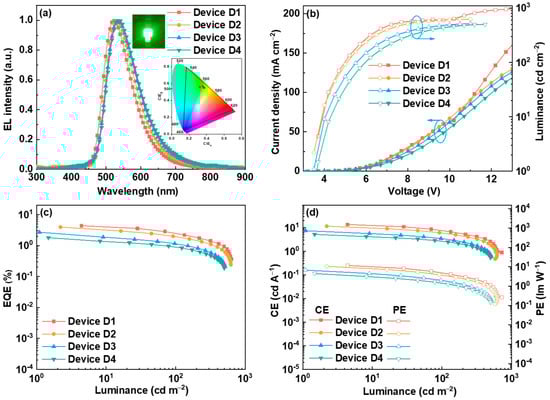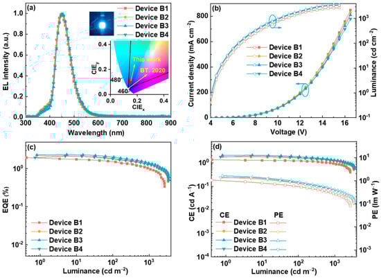 EL performance of DCBz-BCN: (a) EL spectra, (b) relationship of current density (J)-voltage (V)-luminance (L), (c) relationship of EQE vs. luminance, and (d) relationship of CE and PE vs. luminance.