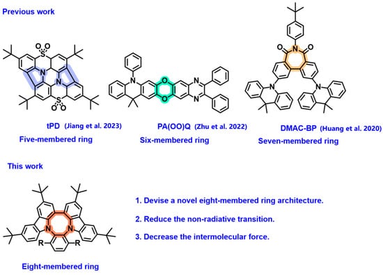 Organic light-emitting diodes (OLEDs) stand out as the most promising contenders for the next-generation display and illumination technologies thanks to their high efficiency, flexible device architectures, and diverse multicolor emissions [1,2,3]. OLEDs are expected to become the future direction of development [4,5,6]. Moreover, OLEDs will attract increasing attention from industry stakeholders and the scientific research community [7,8,9,10]. The emissive layer is the most prominent layer of OLEDs, and the device emission color, contrast ratio, and external efficiency are dependent on the luminescent materials of this layer [11]. However, in the doping process, the aggregation quenching effect caused by the intermolecular interaction force makes emitting materials challenging [12,13,14]. Generally, flexible molecular skeletons suffer from severe structural relaxation, leading to reduced performance in OLED. Therefore, it is wise to develop novel chemical structures in place of a flexible molecular skeleton. Extensive research on the structure of organic luminescent materials has drawn significant attention to the conjugated fused-ring structure. Up to now, the construction of nonplanar rigid structures in molecules has become a good strategy to solve the problem [15,16,17], as it contributes to suppressing intermolecular interactions and non-radiative transitions, thereby enhancing the photoluminescence quantum yield (PLQY) and maximum EQE [18,19,20]. In 2023, Jiang et al. synthesized a five-membered ring rigid structure (tPD) (Scheme 1), which effectively limited the relaxation vibrations of the excited state and minimized non-radiative transitions, significantly improving the EQE to 22% and mitigating the efficiency roll-off [21]. This demonstrates the effectiveness of rigid structures in enhancing the performance of OLEDs. In 2022, a six-membered ring rigid skeleton structure was formed by partially connecting the donor and acceptor using two oxygen atoms (PA(OO)Q), achieving the maximum EQE of 19.4% [22]. This shows that specific molecular designs can lead to significant improvements in OLED performance. In 2020, You et al. developed a twisted heptagonal diimide acceptor with well-balanced structural rigidity and rotatability for the synthesis of a highly efficient aggregation-induced delayed fluorescence material (DMAC–BPI) [23]. The rigid structure can inhibit the rotation of intramolecular groups and reduce the rate of nonradiative transitions. Additionally, the moderate flexibility can inhibit the strong π-π packing between molecules and reduce the exciton quenching in the aggregate state, which greatly improve the performance of OLEDs [24,25,26].