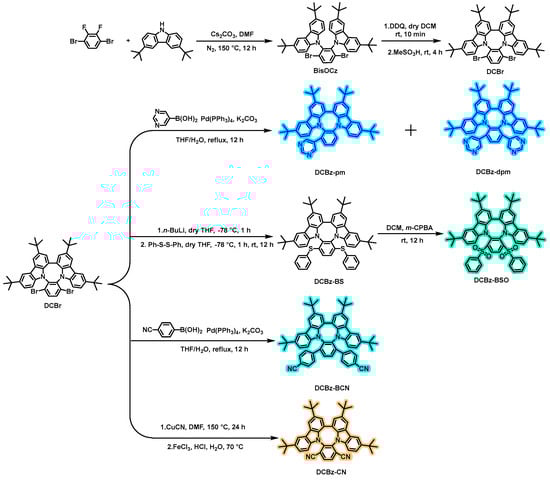 Synthetic route of the emitters based on the eight-membered ring.