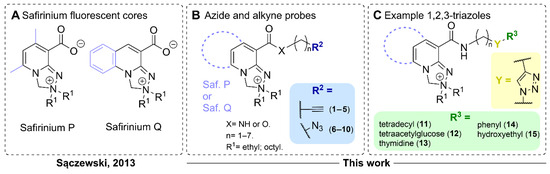 Structures of Safirinium P and Q dyes and their “click”—oriented modifications described here: (A) structures of Safirinium P and Q zwitterions [23]; (B) a general structure of Safirinium-based alkyne probes 1–5 and azide probes 6–10 obtained herein; and (C) a general structure, for example, 1,2,3-triazole derivatives 11–15 of the Safirinium-based azide and alkyne probes.