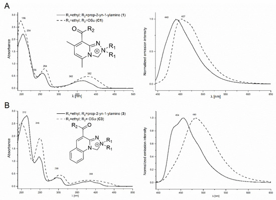 Comparison of UV–Vis absorption and emission spectra of Safirinium-based alkyne probes and their parent NHS esters: (A) alkyne probe 1 and NHS ester C1 (diethyl Safirinium P); and (B) alkyne probe 3 and NHS ester C3 (diethyl Safirinium Q). All absorption spectra were measured for 10−4 mol/dm3 acetonitrile solutions and emission spectra were measured for 10−7 mol/dm3 acetonitrile solutions of respective substances.
