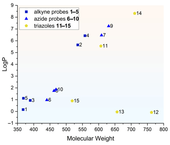 Octanol–water partition coefficient (LogP) values calculated for alkyne-functionalized probes 1–5 (■), azide-functionalized probes 6–10 (▲), and triazoles 11–15 (⬟), plotted against the corresponding values of molecular weight (MW) for each compound. MarvinSketch 22.22 software was used for LogP calculation.