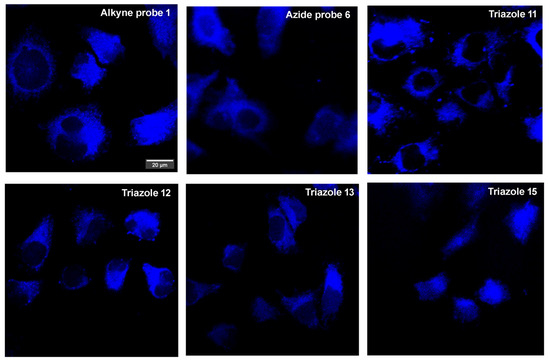 In the next move, we examined the application of selected probes (alkyne 1 and azide 6) and triazole derivatives (11, 12, 13, and 15) for fluorescent microscopic observation. For this purpose, we used CHO-K1 cells, and the slides were prepared in accordance with the procedure described in the experimental section, which was similar to the methods used in a previous study on pyridine derivatives [40]. We observed that both the Safirinium based probes (1 and 6) and their triazole derivatives remain stable and fluorescent under the microscopic observation conditions. These probes were capable of entering the cytoplasm of the cells; however, they did not penetrate the nuclei, as demonstrated in Figure 6. There was no significant signs of cell death or damage upon staining with Safirinium derivatives. The observation used standard equipment and settings with no tweaks or addons necessary. Therefore, for this first study, we can conclude that the presented probes and their triazole derivatives can be used for fluorescent microscopy imaging applications. This is in good agreement with the earlier research on fluorescent staining with Safirinium NHS esters, like compounds C1–C4 (Figure 2A) [25,31].