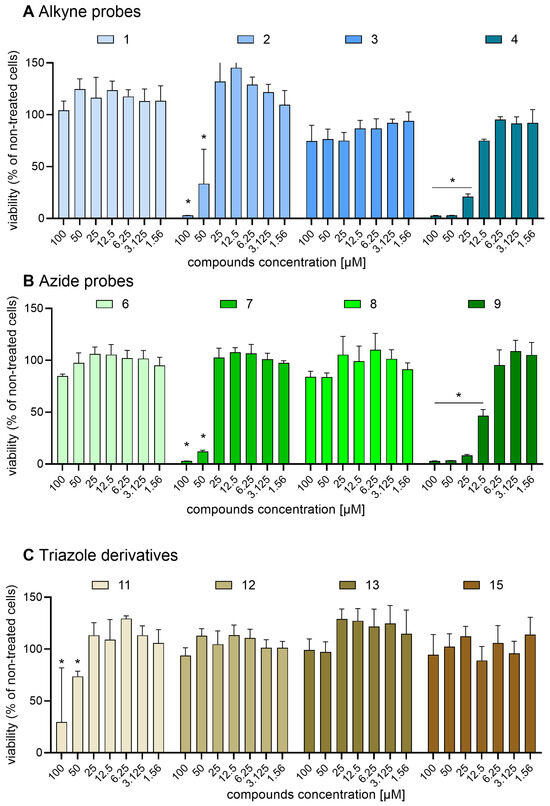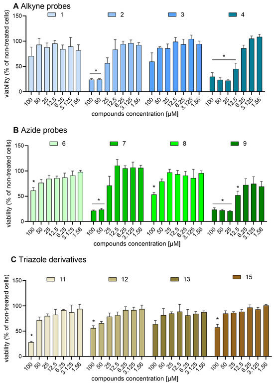 Effect of Safirinium-based probes and their triazole derivatives on Chinese hamster ovary (CHO-K1) cells viability: (A) alkyne probes 1–4; (B) azide probes 6–9; and (C) triazoles 11–13 and 15. CHO-K1 cells were cultured overnight and then incubated in growing concentrations of the compounds. Cell viability was determined by the MTT assay after 24 h of incubation with the tested compounds. Each bar represents mean (±S.E.M.) percentage of viability (in comparison to non-treated cells normalized to 100%). The asterisk-(*) marked results were considered statistically significant at the p level of 0.05, n = 4 (Kruskal–Wallis test with Dunn’s post hoc test).
